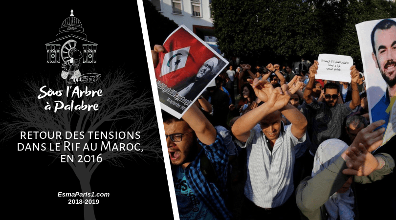 Le 28 octobre 2016, la mort du jeune poissonnier Mouhcine Fikri fit ressurgir cet esprit contestataire, rassemblant un grand nombre de Rifains. En premier lieu, une forte demande de justice était au coeur des revendications. En effet, le chômage s’élève à plus de 21% dans cette région, soit deux fois plus que dans le reste du pays, et l’économie grise (3) a une place prépondérante dans la vie rifaine. C’est en partie pourquoi la mort de ce pêcheur a provoqué un élan de compassion et d’indignation de la part du reste de la population qui réclamait une enquête et une justice pour ce jeune homme, mettant ainsi en porte-à-faux les forces de police. Chômeurs, jeunes, travailleurs, femmes et hommes ont, ainsi, commencé à manifester pacifiquement. Très vite, les revendications de justice suite à la mort de ce jeune homme se sont étendues : création d’usines, d’universités, d’hôpitaux, d’emplois, prolongement de voies ferroviaires jusqu’à Al-Hoceïma … Mais aussi la mise en place d’une lutte efficace contre la corruption et particulièrement celle qui touche le secteur de la pêche. Ces manifestations sont en continuités avec celles du “20 février” (4). Aboubakr Jamaï, professeur à l’Institut américain universitaire à Aix-en-Provence, explique sur le plateau de France 24, ainsi que l’assimilation des deux mouvements n’est pas une surprise puisque “les mêmes causes produisent les mêmes effets”. Toujours selon lui, il n’y a pas de volonté séparatiste mais une simple revendication d’une reconnaissance des droits, tout comme en 2011 (5). Par ailleurs, Maati Monjib, historien marocain et président de l’association pour la liberté de la presse (6), considère dans un entretien réalisé pour le journal “Humanité”, que de nombreux liens peuvent être trouvés entre les deux mouvements et que de nombreux leaders du Hirak faisaient aussi partie de celui du 20 février. Selon lui, “Le M20F se réveille aujourd’hui grâce au Hirak et il manifeste depuis des mois dans les différentes villes du Maroc pour soutenir les Rifains… et revendiquer la démocratie, car le pays est en pleine régression sur le plan des libertés publiques et des droits humains.” (7)