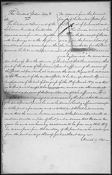 L’affaire a finalement été portée devant la Cour suprême des États-Unis qui fait face à des problèmes internationaux. Les abolitionnistes américains ont unanimement soutenu les accusés. Elle a reconnu que Cinqué et ses compagnons se sont légitimement défendus face à leur réduction en esclavage. « … Il est un droit fondamental de tous les êtres humains dans les cas extrêmes, résister à l’oppression et appliquer la force contre l’injustice extrême. » La bataille juridique se conclut en 1841, par une victoire pour les mutins. La Cour suprême finit par reconnaître leur statut de personnes libres car asservies illégalement.