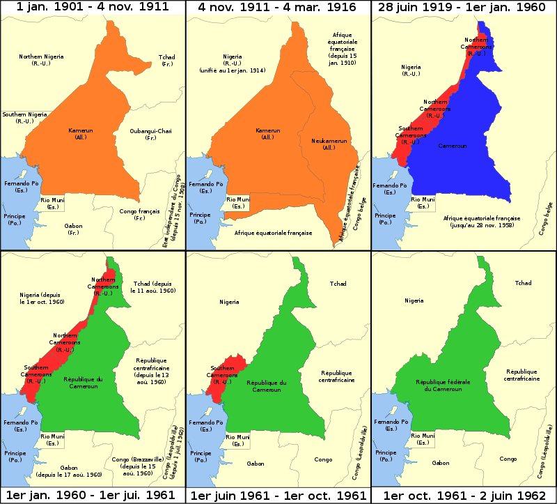Pendant la Première Guerre mondiale, le Cameroun est conquis par les forces franco-britanniques. Après la guerre, le territoire est partagé entre la France et le Royaume-Uni puisque le Cameroun est placé sous mandat international de la Société des Nations. La France obtient la plus grande partie du Cameroun et le reste revient au Royaume-Uni.