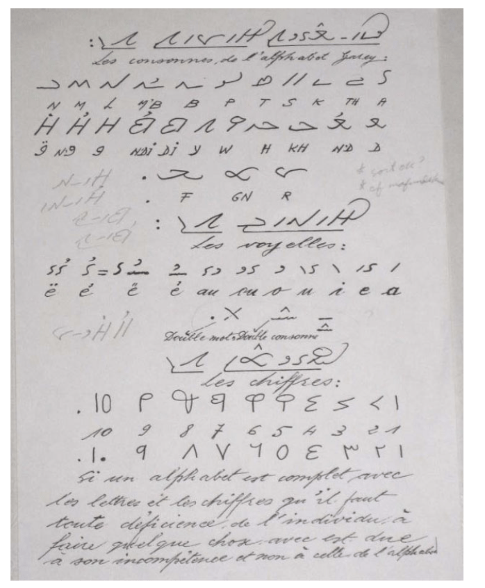(Tableau d’Assane Faye de l’alphabet Garay, ancien alphabet wolof)